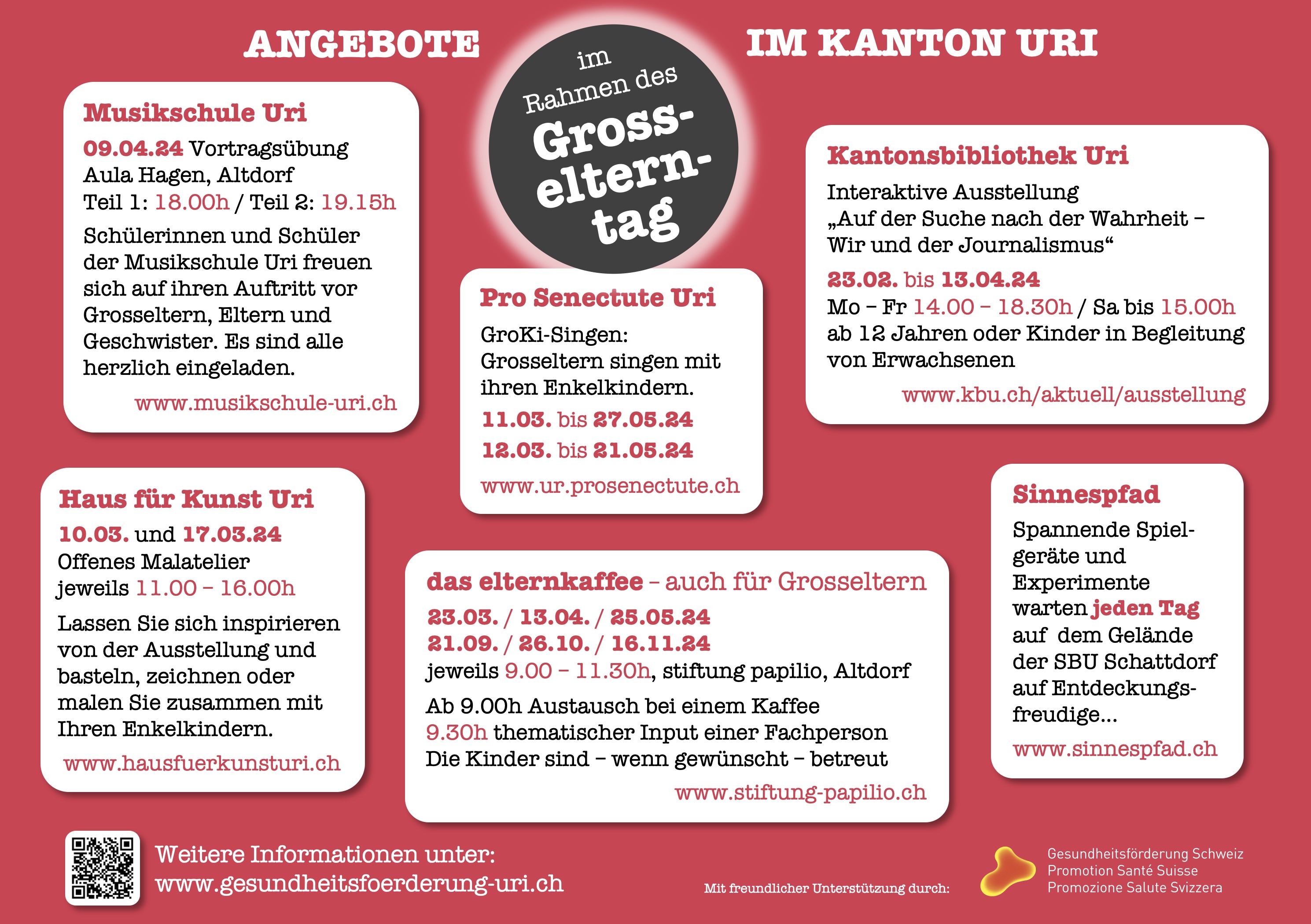 Für uns auch ein Tag, um auf die gesundheitsförderlichen Aspekte dieser Begegnungen über die Generationen hinzuweisen. Gemeinsam mit interessierten Akteuren gestalten wir ein interessantes Programm für Grosseltern und Enkelkinder. An diesem speziellen Tag und darüber hinaus.