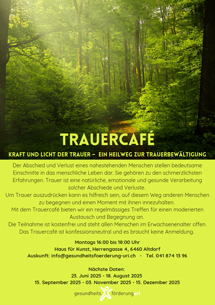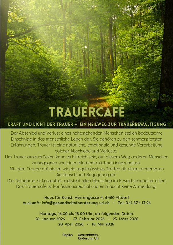 Der Abschied und Verlust eines nahestehenden Menschen stellen bedeutsame Einschnitte in das menschliche Leben dar. Sie gehören zu den schmerzlichsten Erfahrungen. Trauer ist eine natürliche, emotionale und gesunde Verarbeitung solcher Abschiede und Verluste. Um Trauer auszudrücken kann es hilfreich sein, auf diesem Weg anderen Menschen zu begegnen und einen Moment mit ihnen innezuhalten. Mit dem Trauercafé bieten wir ein regelmässiges Treffen für einen moderierten Austausch und Begegnung an.