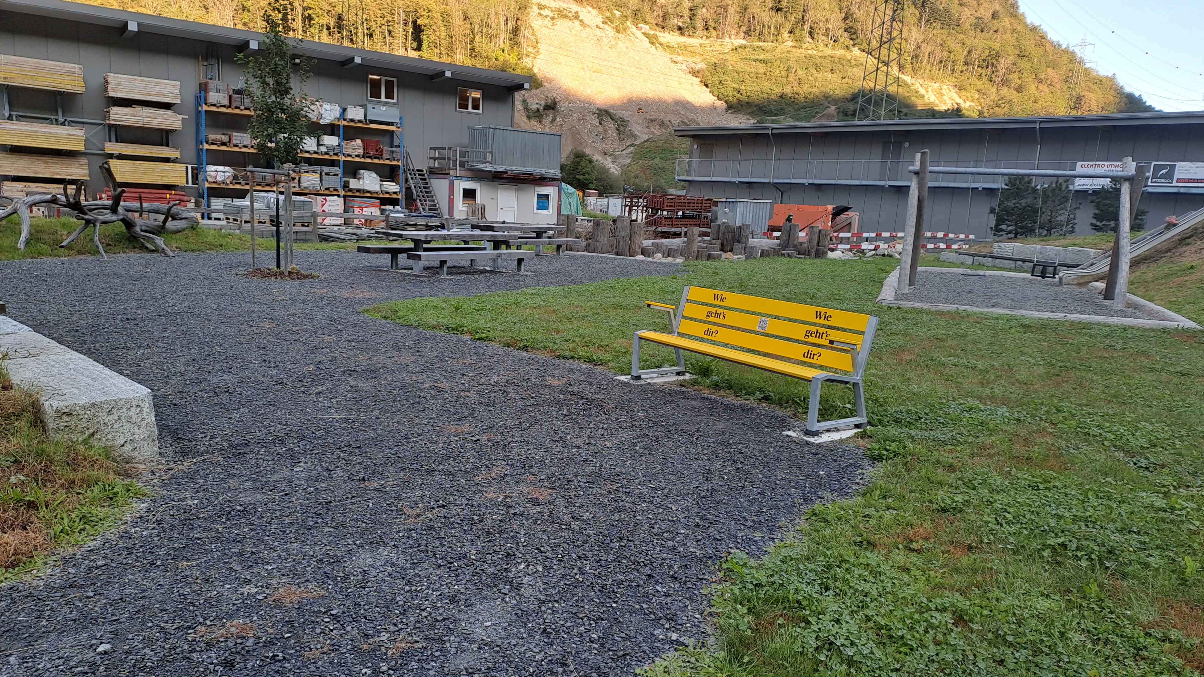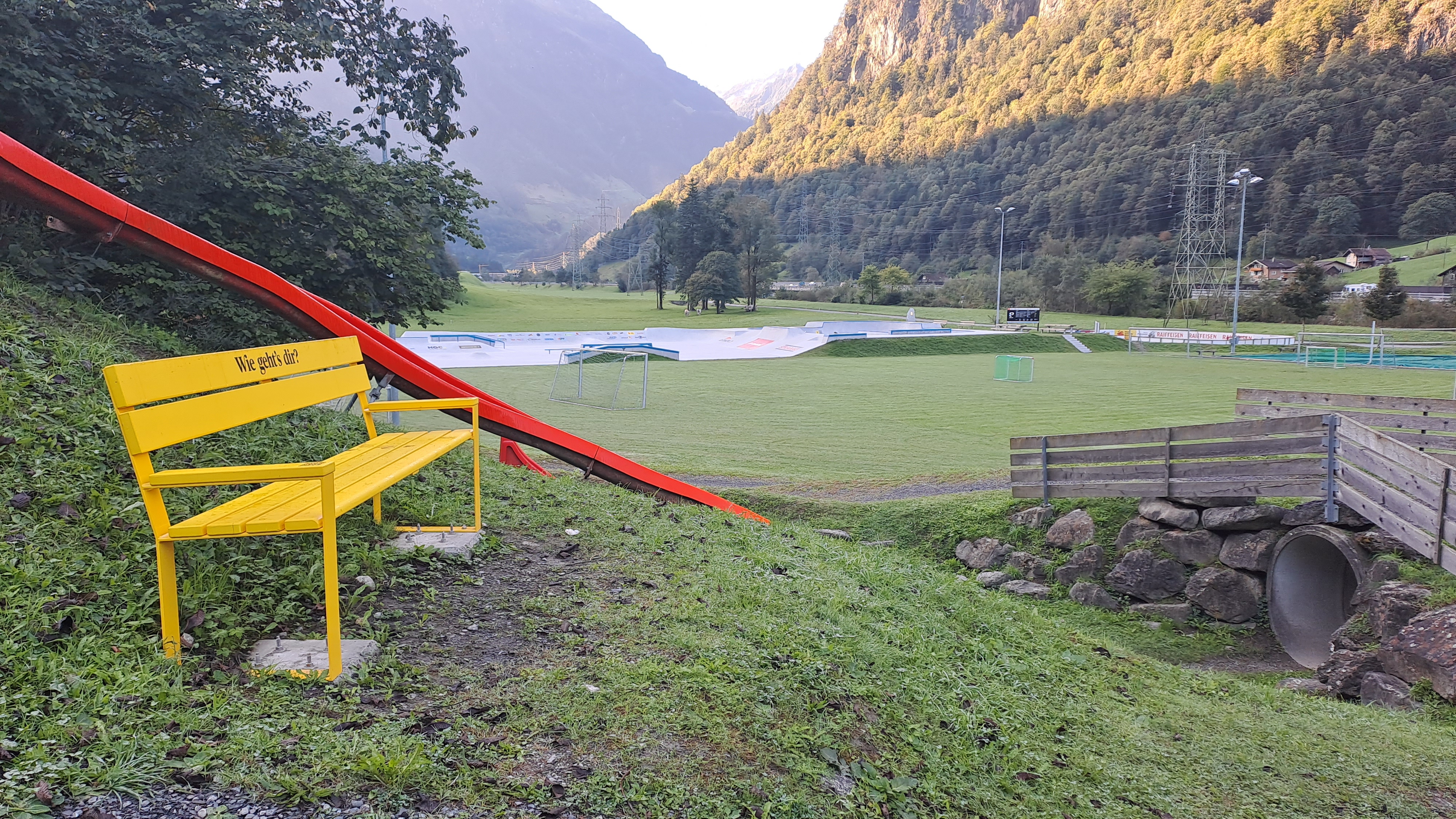 Die Sitzbank liegt direkt beim Spiel- und Begegnungsplatz Grund. Die auffällig gelbe "Wie geht es dir?"-Bank bietet die Möglichkeit zur Nutzung, während die Kinder auf dem Spielplatz spielen.