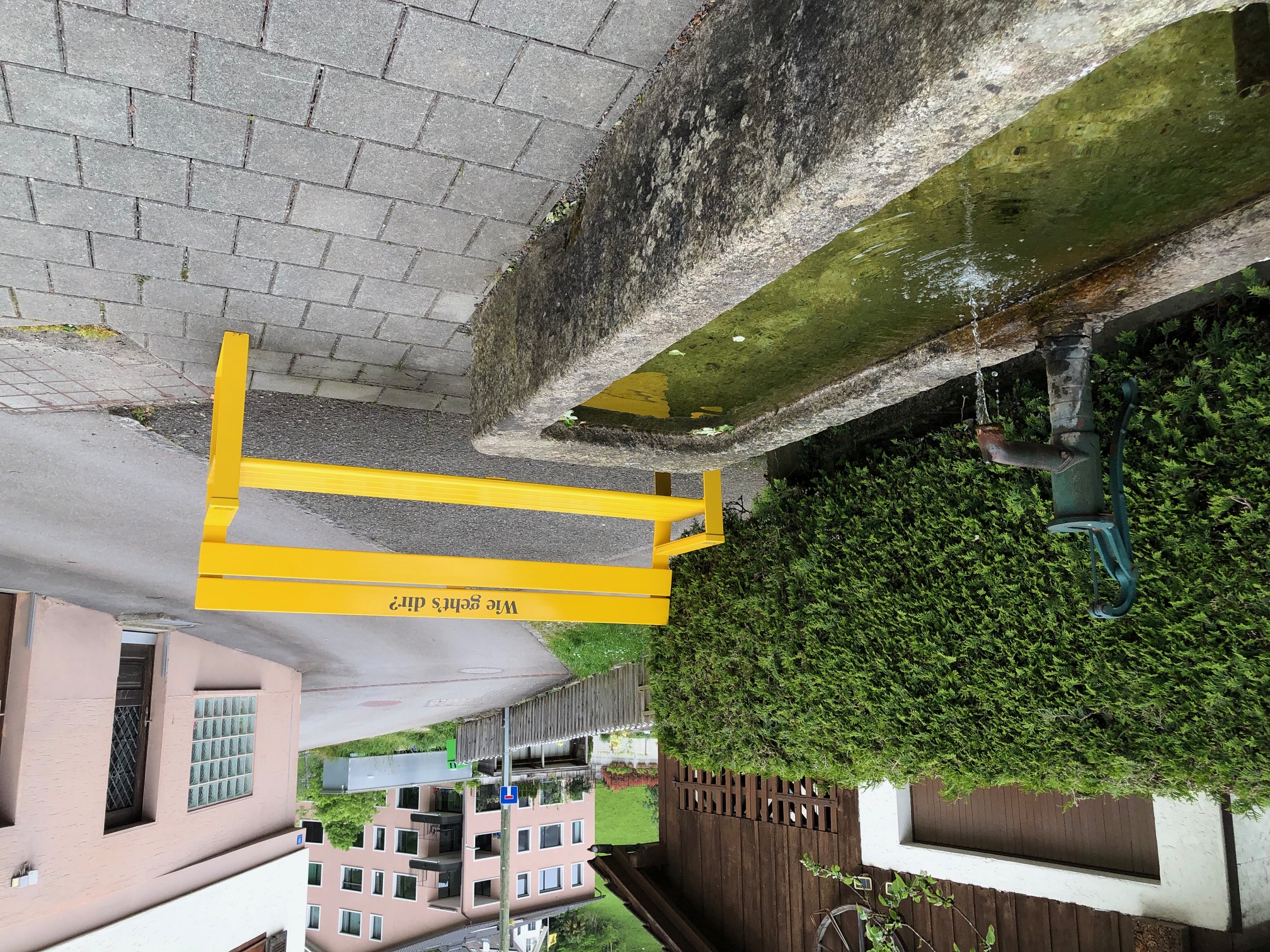 Die auffällige gelbe "Wie gehts dir" Sitzbank befindet sich gleich hinter dem Restaurant Laterne beim Brunnen. Es ist ein ruhiger Platz, etwas abseits vom Verkehr der Axenstrasse und daher ideal für eine kurze Pause.