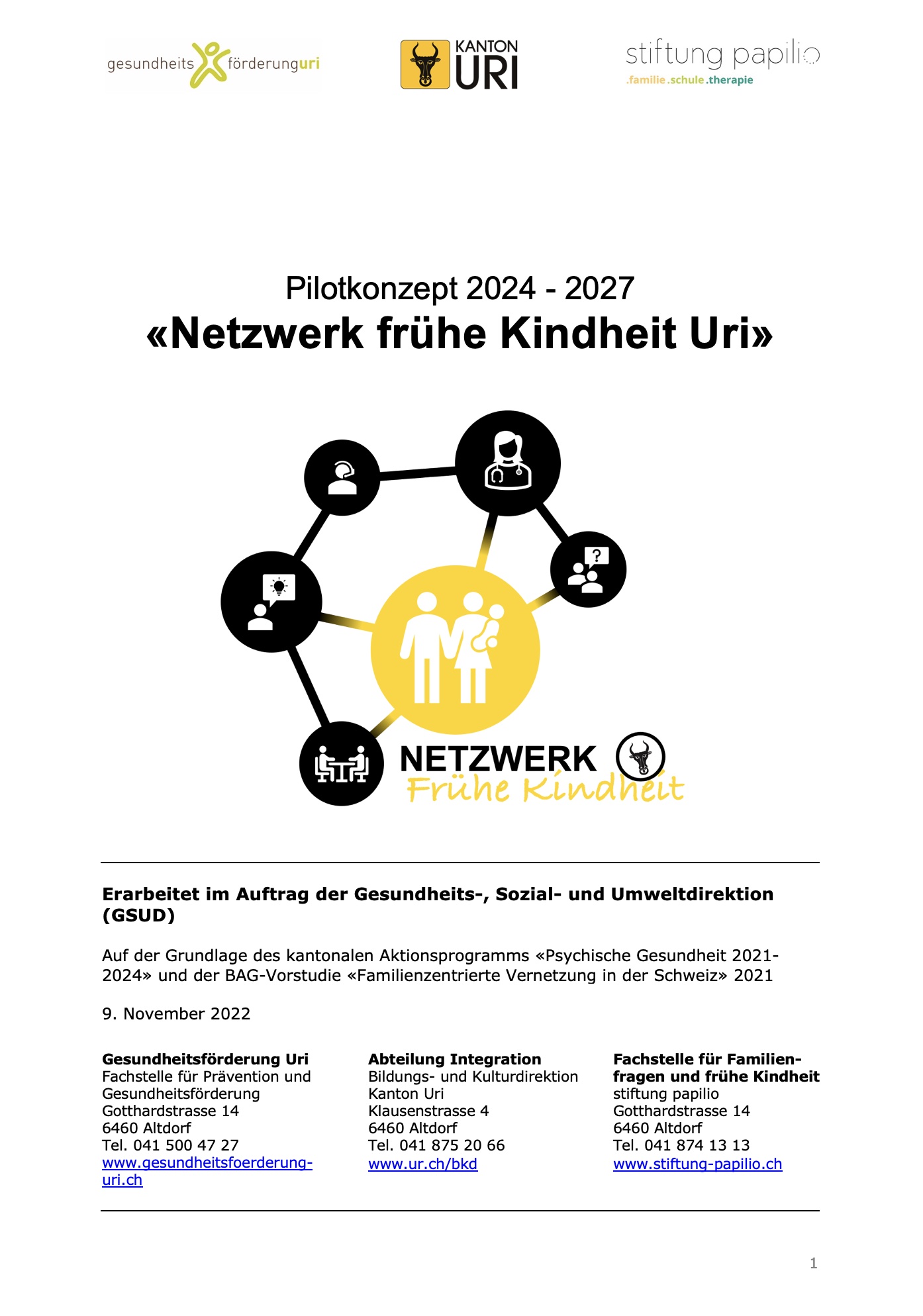 Im 2021 hat sich der Kanton Uri nach Anfrage durch die Hochschule Luzern als Pilotkanton an der BAG-Vorstudie «Familienzentrierte Vernetzung in der Schweiz» beteiligt. Ziel dieser Vorstudie war, Schweizer Netzwerke im Frühbereich in Hinblick auf ihr Potenzial zur Früherkennung und niederschwelligen Begleitung von belasteten Familien zu analysieren und mit gut erforschten Netzwerken im Ausland zu vergleichen. Als Referenzmodell wurden die «Frühen Hilfen» aus Österreich genutzt.