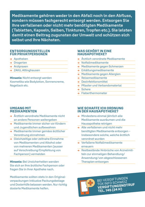 Hier finden Sie den neuen Flyer zur «Sammelaktion Medikamente». Dieser Flyer wurde im 2025 in interkantonaler Zusammenarbeit mit den Kantonen AG, BL, BS, LU, NW, OW, UR, SZ und ZH gemeinsam erarbeitet und ersetzt den bisherigen Flyer.
